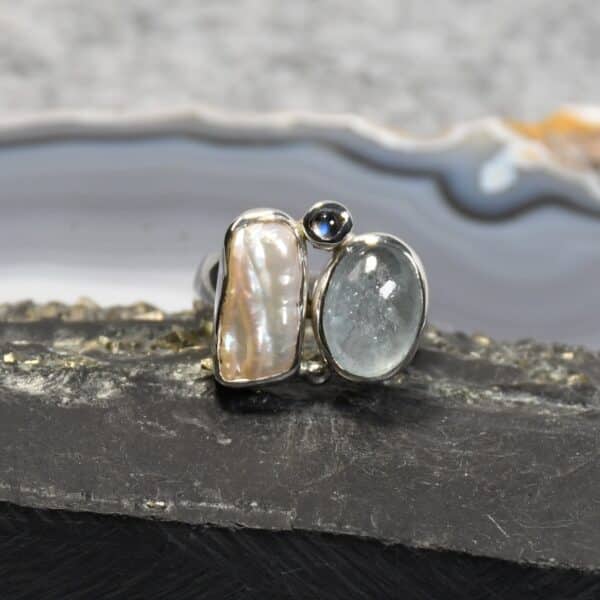 Aquamarin Ring mit Biwaperle und Mondstein, 925er Silber