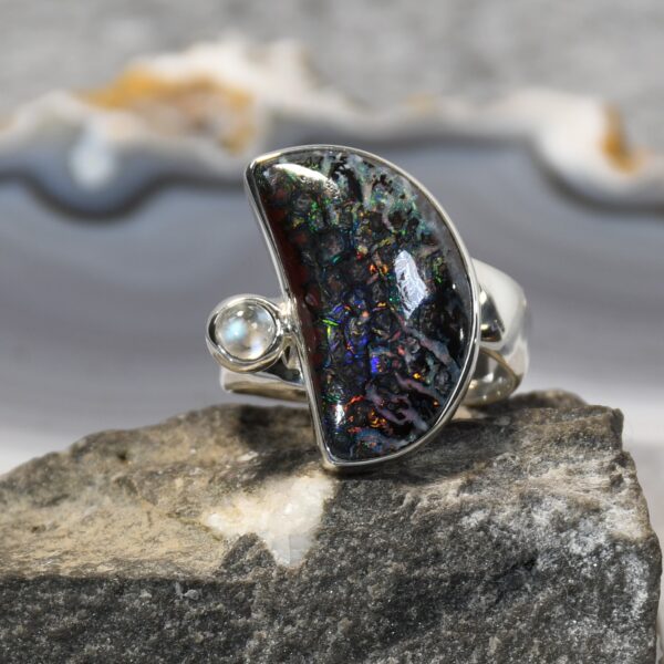 Boulder Opal Ring mit Mondstein, 925 Silber, opalisierendes Holz