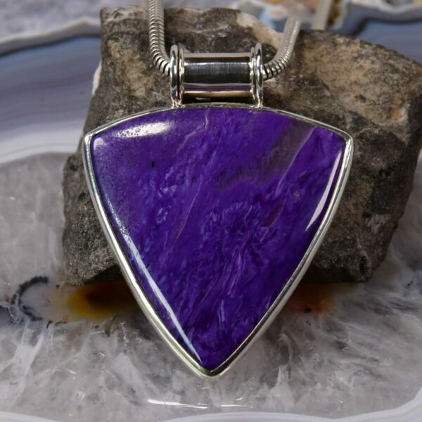 Der verarbeitete Charoit ist einzigartig gezeichnet und von seltener, hervorragender Qualität.