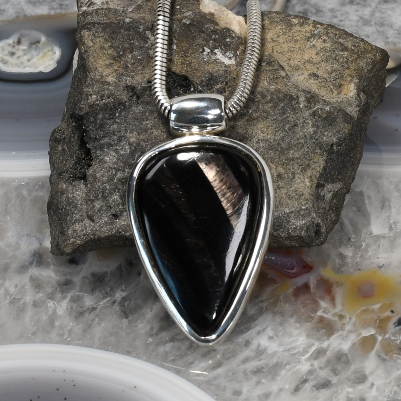 Der verarbeitete Hypersthen ist stark changierend und von hervorragender Qualität.