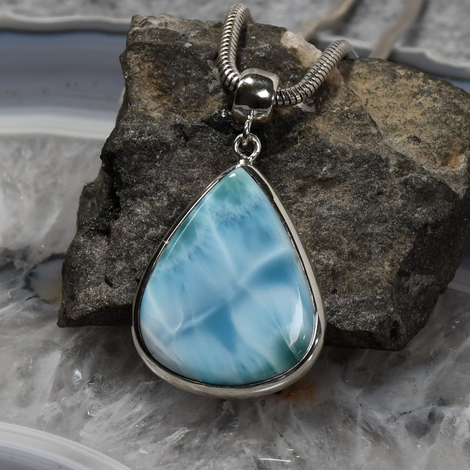 Der verarbeitete Larimar ist einzigartig gezeichnet und von hervorragender Qualität.